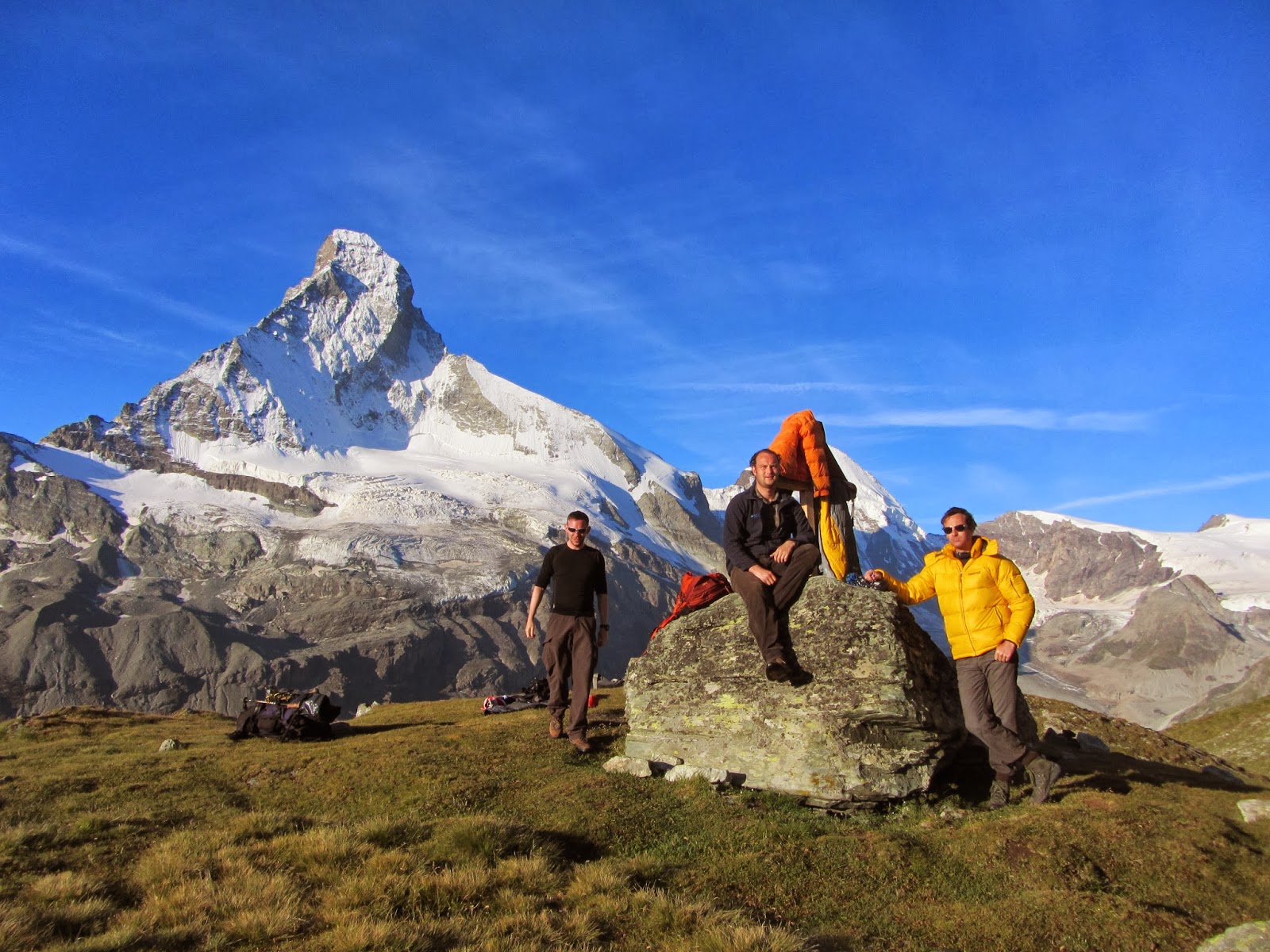 The next day we hiked up to another hut. I can’t remember the name of this one either, it was a few months ago. We got up at lunch time, I ordered an omelette with bacon and Rosti. I was real slow getting up there, and happily took my time because there was no hurry. I enjoyed looking at all the wild flowers and butterflies, Then we walked on a lovely narrow moraine to get there. There was great view of the Matterhorn to our left. After lunch we sat out on the grass and made coffee with the msr reactor. Looking at the Matterhorn under the warm sun we plotted new routes up it and could hear the occasional rock and snowfall come off it.